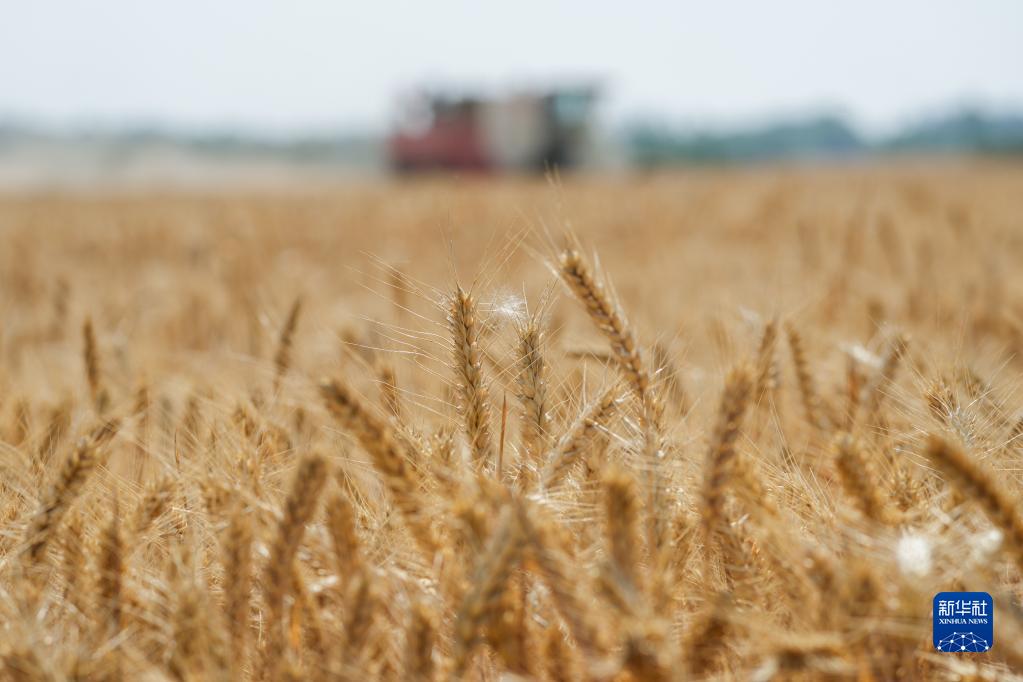 在安徽省亳州市渦陽縣店集鎮(zhèn)宋來寶農(nóng)作物種植專業(yè)合作社,收割機在麥田中收割小麥(6月7日攝)。新華社記者 杜宇 攝