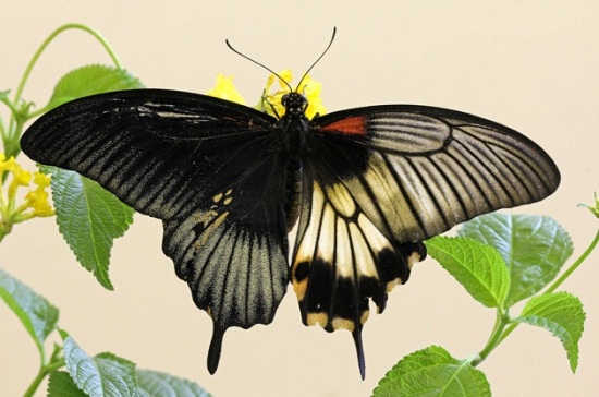 這只“陰陽(yáng)”美鳳蝶左邊是雄性,翅膀呈黑色,右邊為雌性,翅膀上有黃色和紅色的花紋。