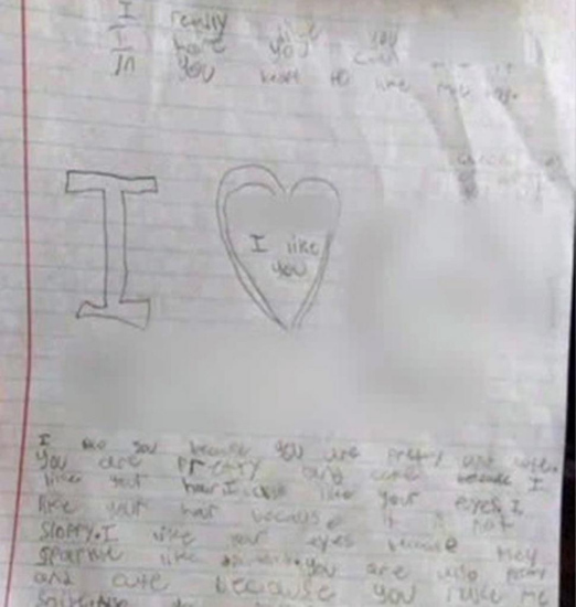 報道稱,這名男童在情書中寫道:“我喜歡你,我喜歡你整齊不蓬松的頭發(fā),我喜歡你閃亮如鉆石的雙眼”,并在情書中畫了一個愛心。