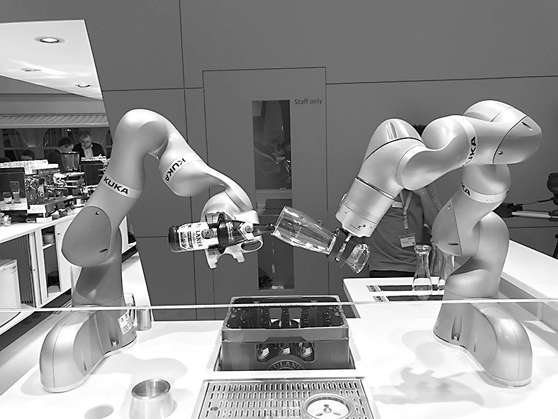 庫卡機(jī)器人正在給觀眾倒啤酒。