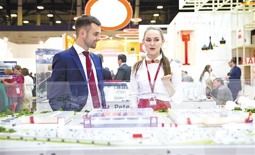 在俄羅斯圣彼得堡國際經(jīng)濟論壇展覽上,俄羅斯莫斯科州展臺的工作人員為與會者講解。新華社記者 吳 壯攝