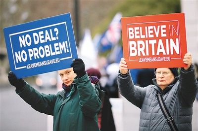 英國議會下院就“脫歐”協(xié)議草案進(jìn)行表決的時間已經(jīng)從2018年12月推遲到2019年1月,“脫歐”前景依然不明。圖為1月7日,支持英國“硬脫歐”的人士在英國首都倫敦的議會大廈外揮舞標(biāo)語。(新華社 蒂姆·愛爾蘭 攝) |