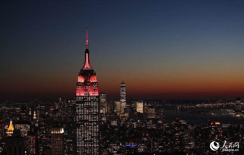 為慶祝中國新年,紐約世貿(mào)中心一號樓首次點亮中國紅。當?shù)貢r間2月4號和5號晚,紐約“雙座地標”帝國大廈和新世貿(mào)中心大樓同時亮燈,喜迎農(nóng)歷豬年。