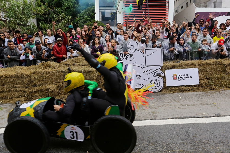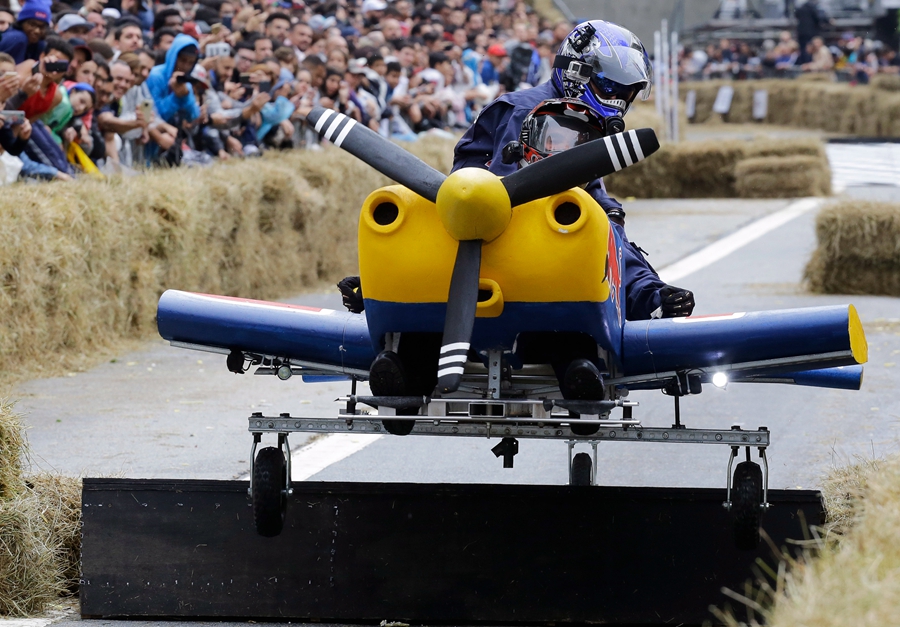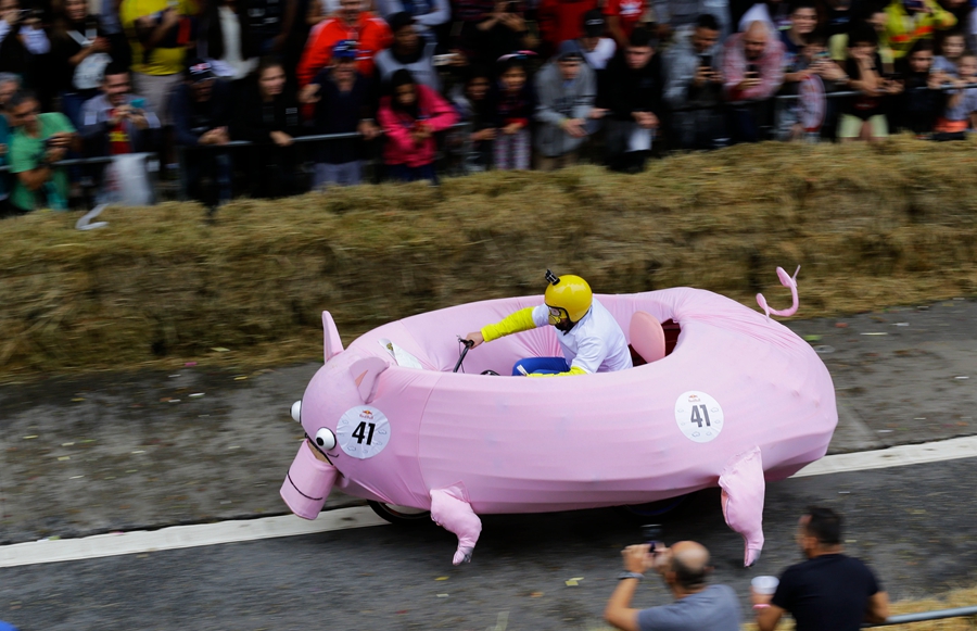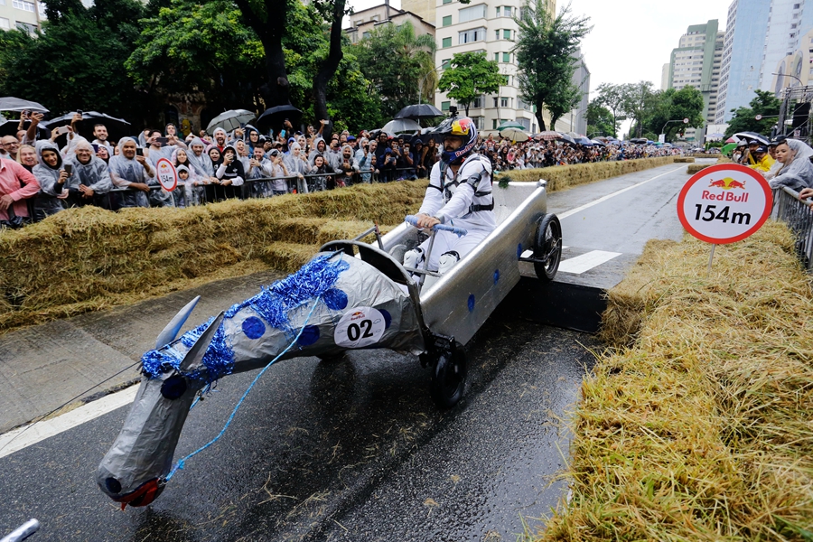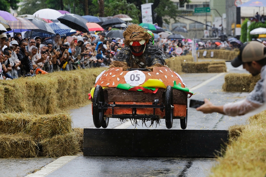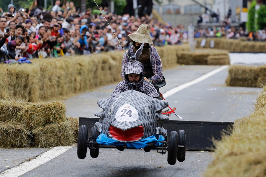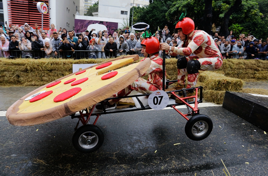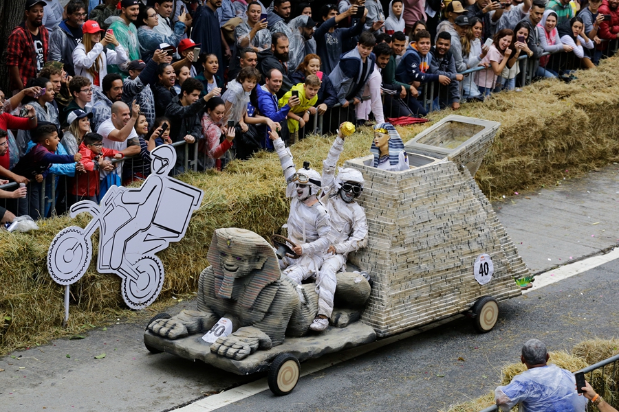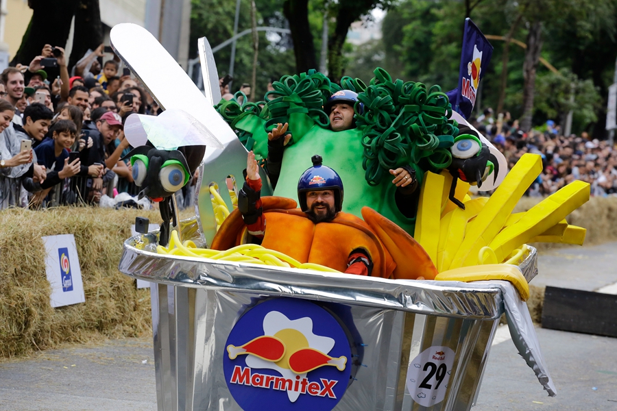 當(dāng)?shù)貢r間2019年4月14日,巴西圣保羅,當(dāng)?shù)嘏e辦紅牛肥皂盒汽車大賽,參賽者將車子打扮成各種奇怪的造型,在沒有動力的情形下滑下下坡道,參加比賽。