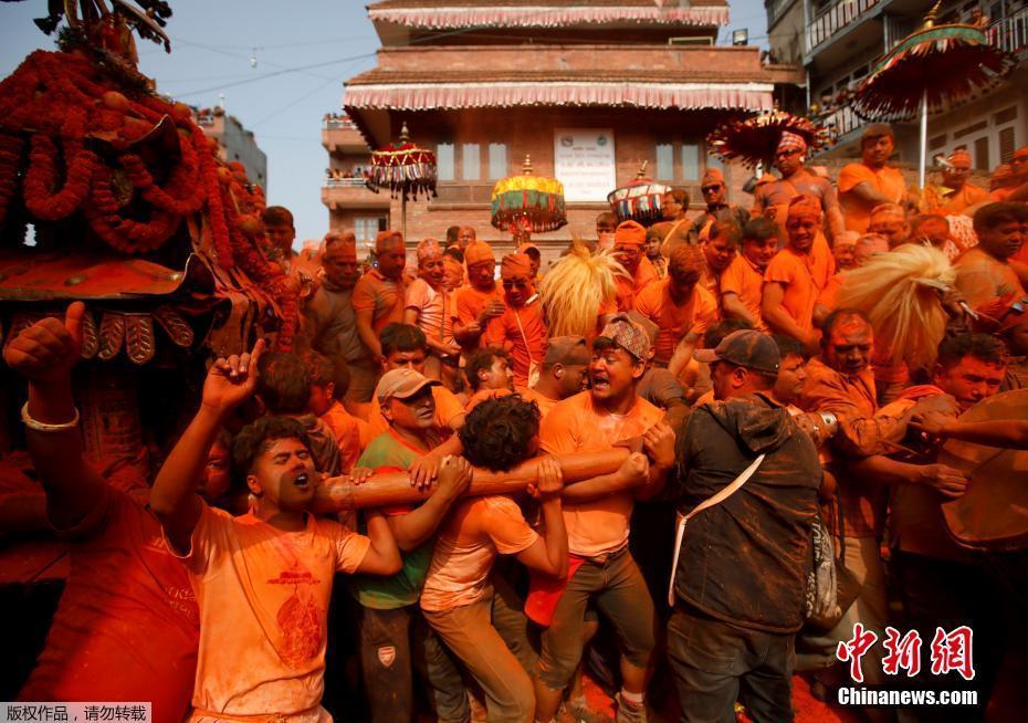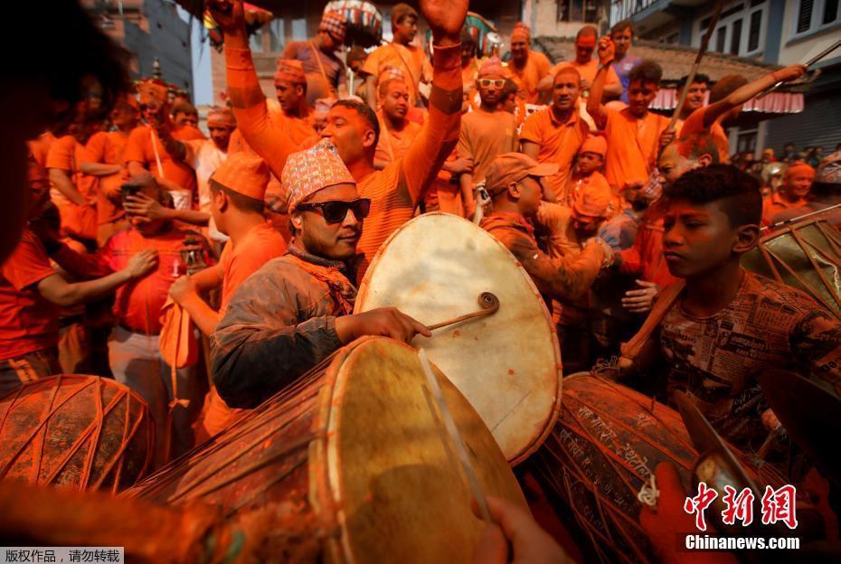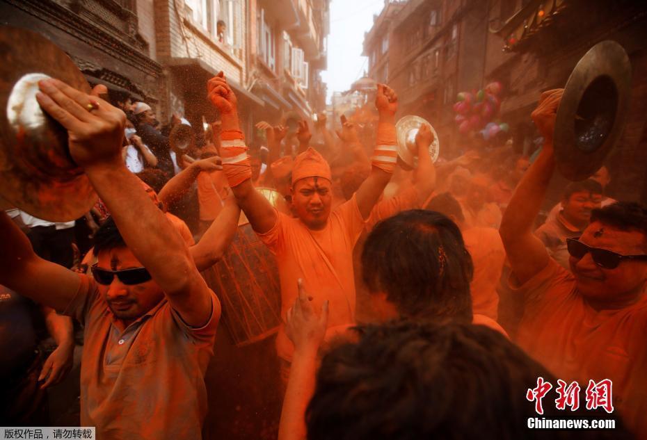 當(dāng)?shù)貢r(shí)間4月15日,尼泊爾巴克塔普爾,人們互相拋撒朱砂粉,慶祝朱砂節(jié)(Sindoor festival )以及尼泊爾新年。