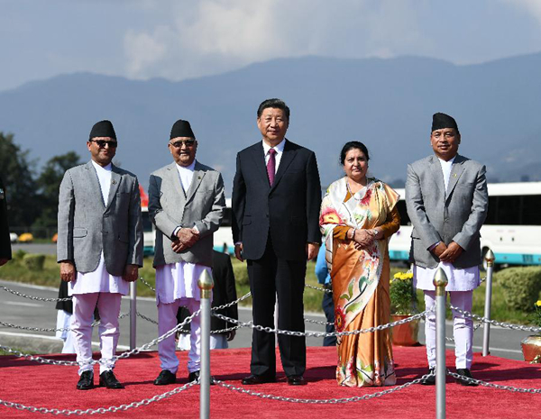 10月12日,國(guó)家主席習(xí)近平乘專機(jī)抵達(dá)加德滿都,開始對(duì)尼泊爾進(jìn)行國(guó)事訪問(wèn)。尼泊爾總統(tǒng)班達(dá)里在機(jī)場(chǎng)為習(xí)近平舉行具有濃郁尼泊爾民族特色的歡迎儀式。新華社記者高潔攝
