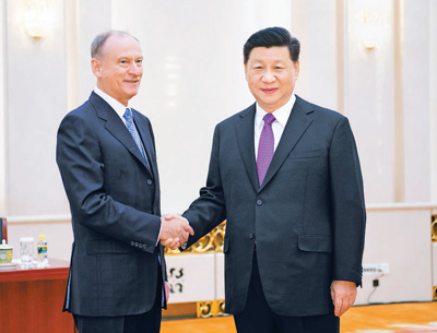 國家主席習(xí)近平2日在人民大會(huì)堂會(huì)見來華出席中俄執(zhí)法安全合作機(jī)制會(huì)議和中俄戰(zhàn)略安全磋商的俄羅斯聯(lián)邦安全會(huì)議秘書帕特魯舍夫。