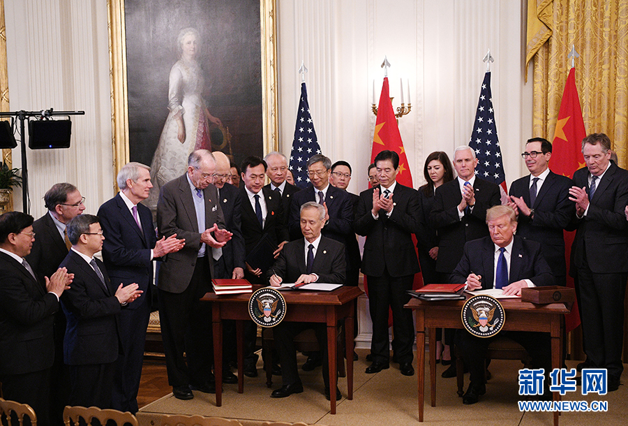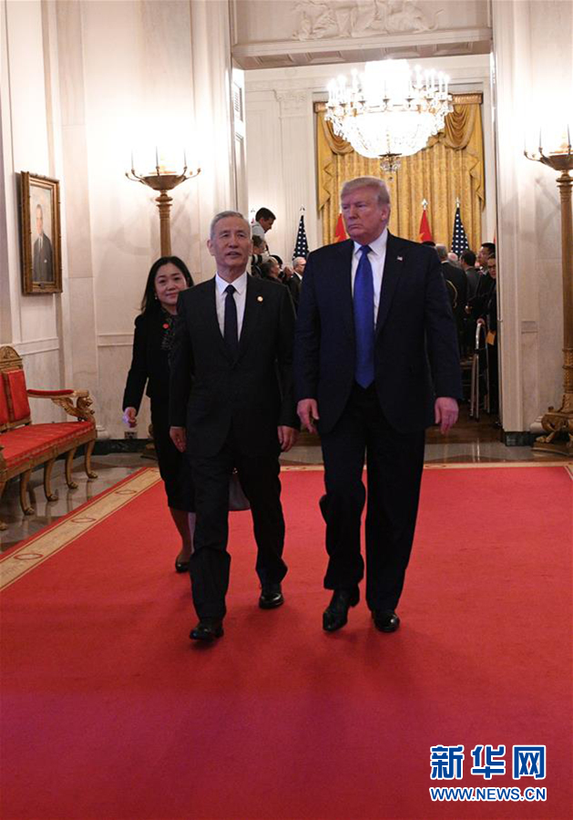 當(dāng)?shù)貢r(shí)間1月15日,中共中央政治局委員、國務(wù)院副總理、中美全面經(jīng)濟(jì)對話中方牽頭人劉鶴與美國總統(tǒng)特朗普在美國首都華盛頓白宮東廳共同簽署協(xié)議文本。 當(dāng)天,中美第一階段經(jīng)貿(mào)協(xié)議簽署儀式在白宮東廳舉行。 新華社記者 劉杰 攝