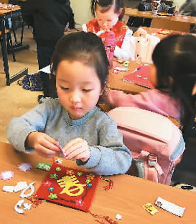 每逢春節(jié),師生都會(huì)裝飾學(xué)校,所有的裝飾物都含有中國元素,比如對聯(lián)、紅燈籠、龍的圖案、福字等。同時(shí),除了圍繞春節(jié)主題設(shè)計(jì)的文化課之外,老師們還會(huì)在課上帶著孩子們做手工、畫畫等,比如剪“春”字、畫屬相、寫“福”字。一個(gè)“春”字、一個(gè)“福”字,讓“年”跳出了紙面。