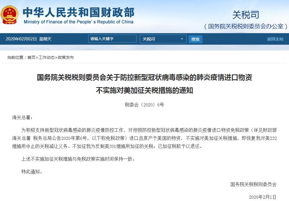 據(jù)國務(wù)院關(guān)稅稅則委員會(huì)網(wǎng)站消息,為積極支持新型冠狀病毒感染的肺炎疫情防控工作,對按照防控新型冠狀病毒感染的肺炎疫情進(jìn)口物資免稅政策進(jìn)口且原產(chǎn)于美國的物資,不實(shí)施對美加征關(guān)稅措施,即恢復(fù)我對美232措施所中止的關(guān)稅減讓義務(wù)、不加征我為反制美301措施所加征的關(guān)稅;已加征稅款予以退還。