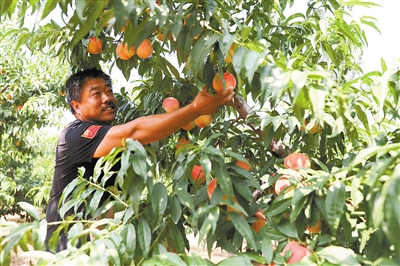 圖為固安縣板材村桃農(nóng)采摘鮮桃。