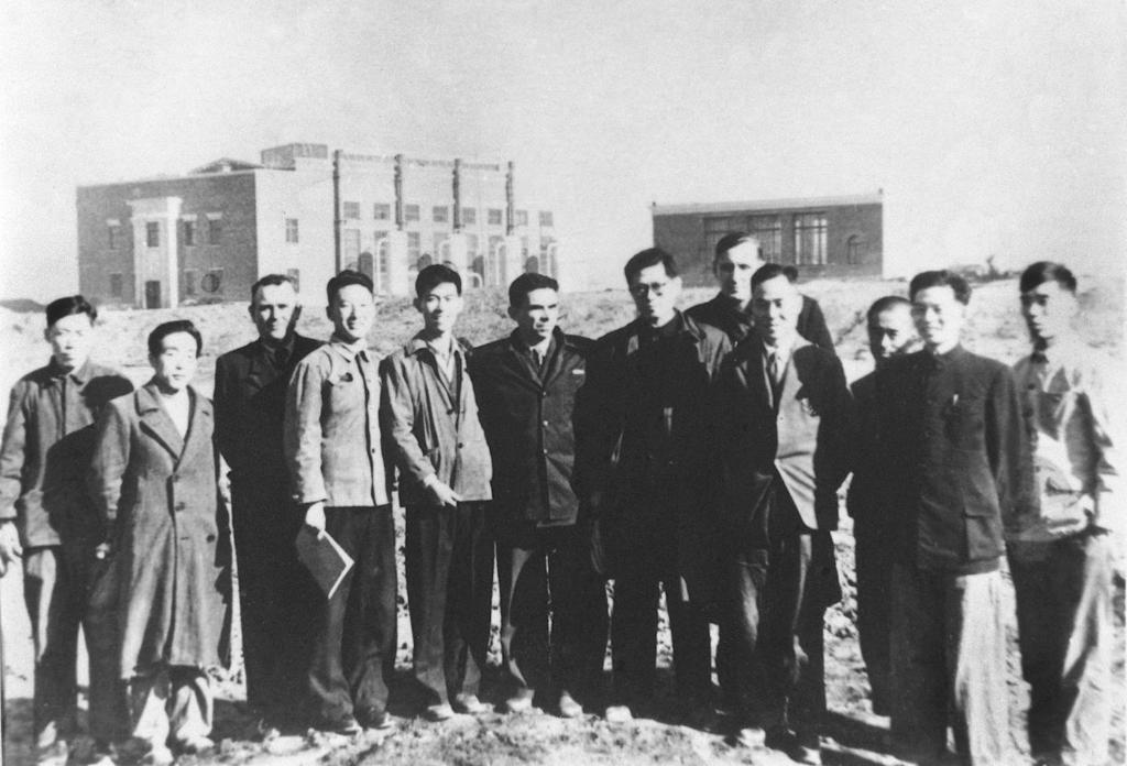 1956年,江澤民同志(左七)在長(zhǎng)春第一汽車(chē)制造廠同援建一汽的蘇聯(lián)專(zhuān)家等合影。新華社發(fā)