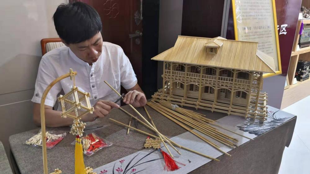 在秸稈扎刻展臺(tái)上,傳承人徐健選取上乘的高粱稈,用來展示傳統(tǒng)家具中的榫卯結(jié)構(gòu),桌上擺放著他的作品《遵義會(huì)議舊址》,展示了古建筑的魅力。省級(jí)非遺項(xiàng)目雕漆技藝傳承人朱江向觀眾講解雕漆技藝相關(guān)情況。