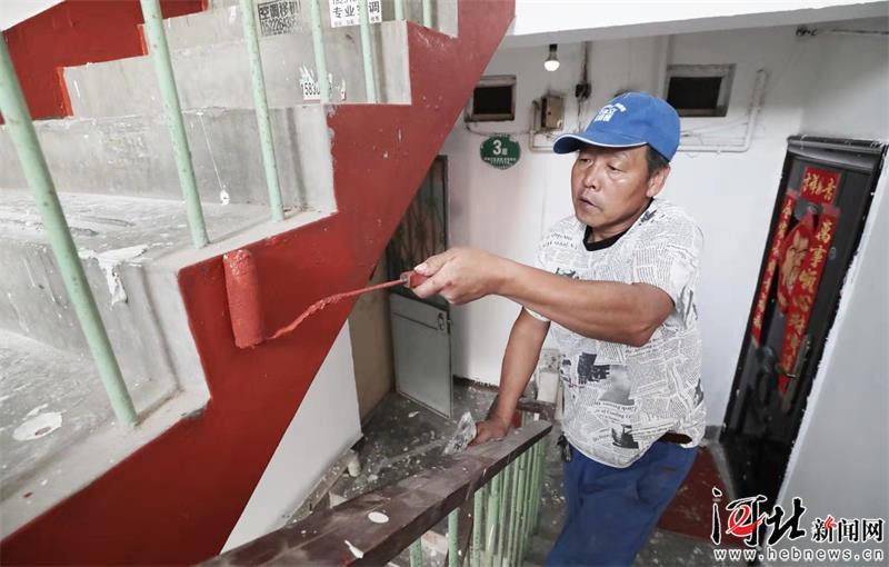圖為9月3日,廊坊市區(qū)華興里供電小區(qū)改造現(xiàn)場(chǎng),工人正在刷新樓道墻壁。 賈珺攝