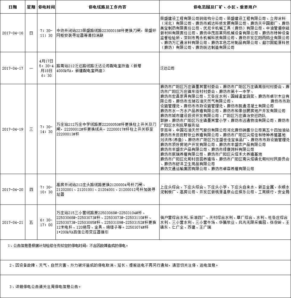 上一篇:廊坊市區(qū)停電信息公告(4月23日--4月26日) 下一篇:廊坊市區(qū)停電信息公告(4月10日--4月14日)